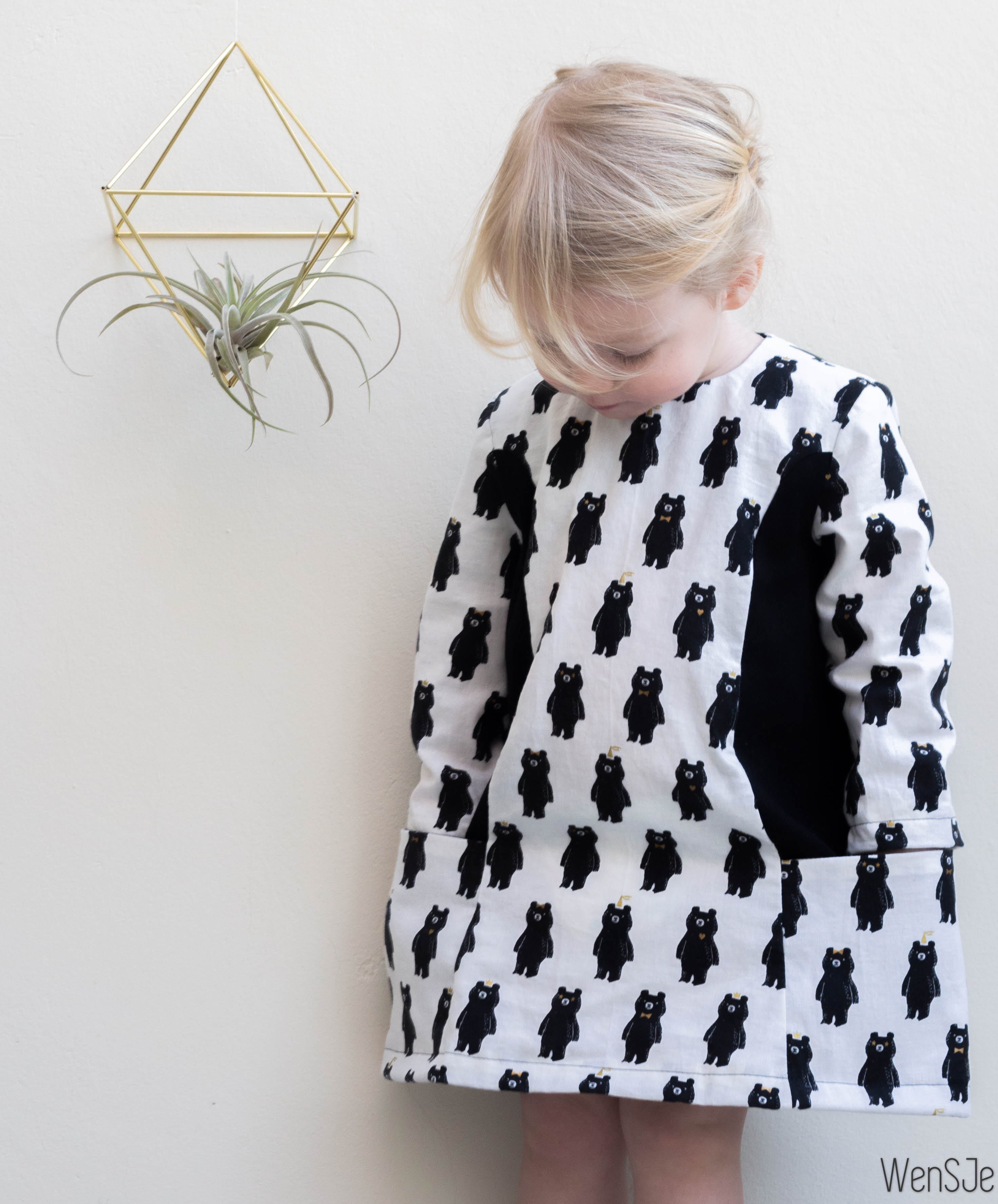 Anderhalve maand geleden droeg ze deze jurk op haar verjaardagsfeestje, onze tweejarige. Sinds dan hing de jurk op de trap of in haar kamertje aan een kapstokje of in de living over haar speelmand. Overal dus, behalve aan haar lijfje. Ze wou hem niet meer aandoen. De beertjes stonden haar niet aan. Totdat ik gisteren het prachtidee kreeg om koekjes in de zakken te verstoppen. Jurk aan. Blije peuter. Blije mama. Tijd voor foto’s. Negeer dus gerust het hoge omkoperijgehalte dat met deze foto’s gepaard gaat.