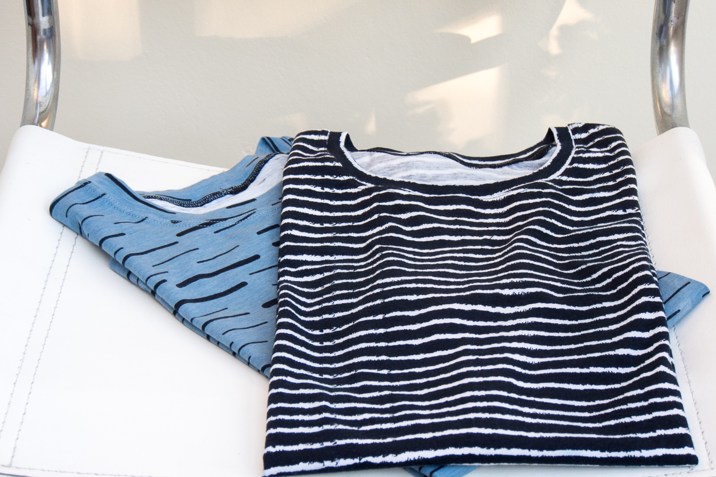 De man des huizes is zwaar benadeeld wat betreft zelfgemaakte kleding. Hij moet me al enkele maanden de oren van de kop zeuren om T-shirts. De stof werd al lang geleden besteld, maar er stonden nog wat Jente-projectjes in de weg. Ocharme. De zielepoot had speciaal geen T-shirts meer gekocht. Want ik zou er maken.