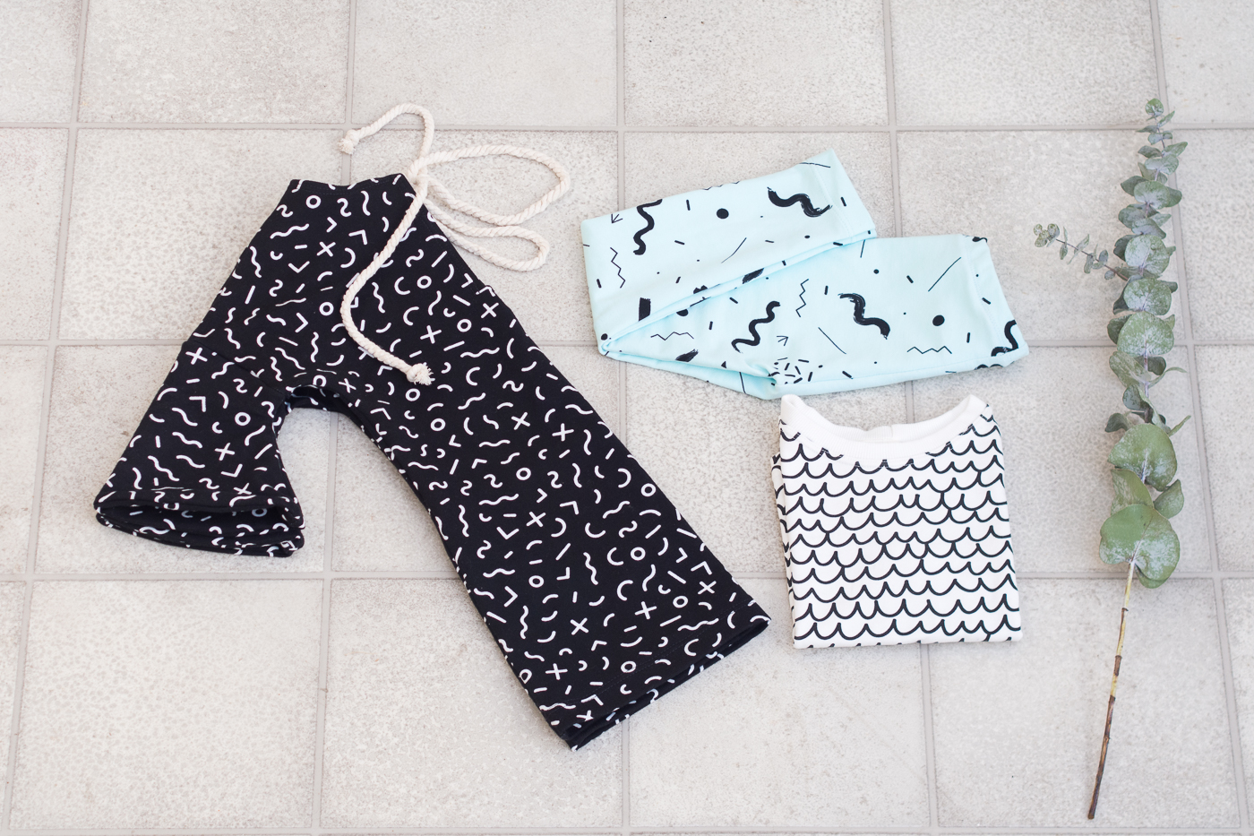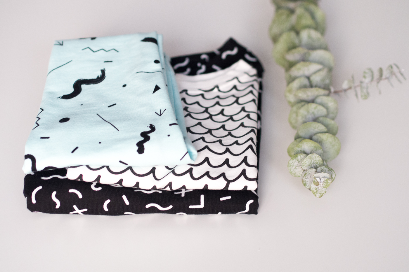 Bambiblauw. Leuke grafische prints gedrukt op zwarte, witte en lichtblauwe stof. Deze vier stoffen vullen de BLOS2 collectie mooi aan en kunnen er ook perfect mee gecombineerd worden. Ik koos nu voor ‘squiggle’ (de zwarte stof met witte bedrukking) en voor de ‘minty’ (blauwe met zwarte vegen en lijnen). De ‘scales’ (wit met zwarte bedrukking) had ik al gemixt met