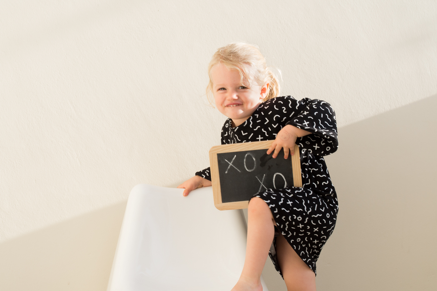 Zondag kreeg ik een pracht van een gesigneerd boek in handen, de nieuwe Stof voor Durf het Zelvers 3 van Griet en Annick. Na heel wat leuke babbels, stoffen neuzen en kopen en veel cake en koekjes naar binnen werken (sorry, de baby heeft honger! 🙂 ), nestelde ik me met ‘Stof 3’ in de zetel. Dat was het moment dat mijn oorspronkelijke plan met de zwart-witte stof gewijzigd werd. Ik zou iets uit dat boek maken! Zoveel leuks! Ik koos hier voor de ‘rechtdoor jurk’ met zakken vooraan en een koord achteraan. Eén van de opties zijn ‘trompetmouwen’. De naam alleen al trok me over de streep om dit eens uit te proberen. Maat 92-98 valt nog een beetje groot voor mijn kleine meid die nu maat 92 heeft. Het is dus een iets zediger jurkje geworden (tenminste als ze haar armen niet in de lucht steekt) dan in het boek en met lange mouwen in plaats van halflange. Maar kom, nu kan ze hem nog lekker lang aandoen.