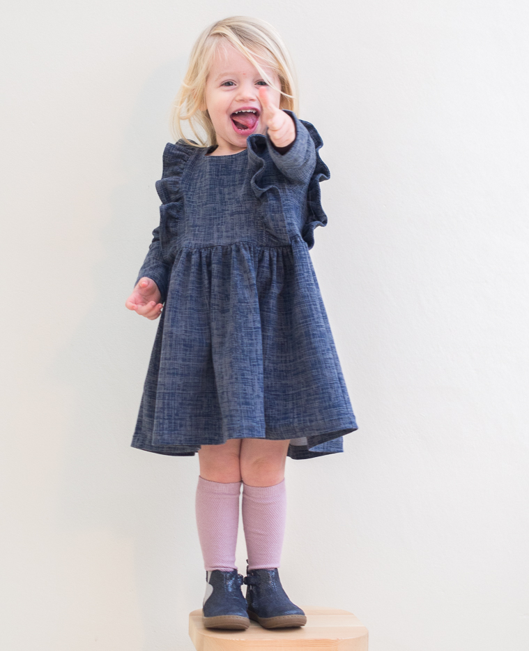 The Millie dress is a sewing pattern for stretchy fabrics. Ideal for twirling and playing. The ruffles reach all the way from the front to back of the bodice and make this a very special and girly dress. The fabric you chose turns your Millie dress into a festive one or into a school- and playproof one.