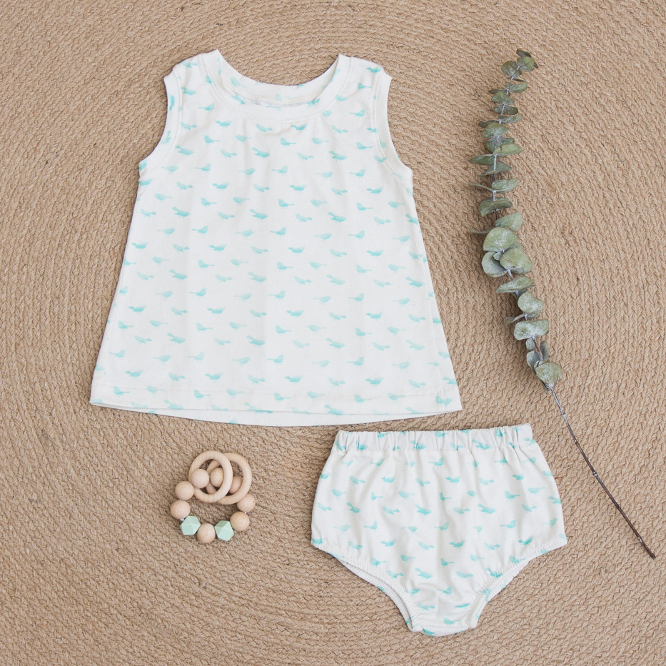 Het warme weer lijkt er eindelijk aan te komen! Dus de zomerpyjama’s kunnen terug bovengehaald worden. Dat is hier vrij gauw nodig, want onze kleuter is een echt oventje. Die loopt zelfs in de winter in haar ondergoed rond thuis. En wou het nu net dat dit geweldige vogelstofje van About Blue Fabrics op mijn pad kwam. Ik wou er een romantisch pyjamaatje van maken. Die stof vraagt daar om, vind ik.