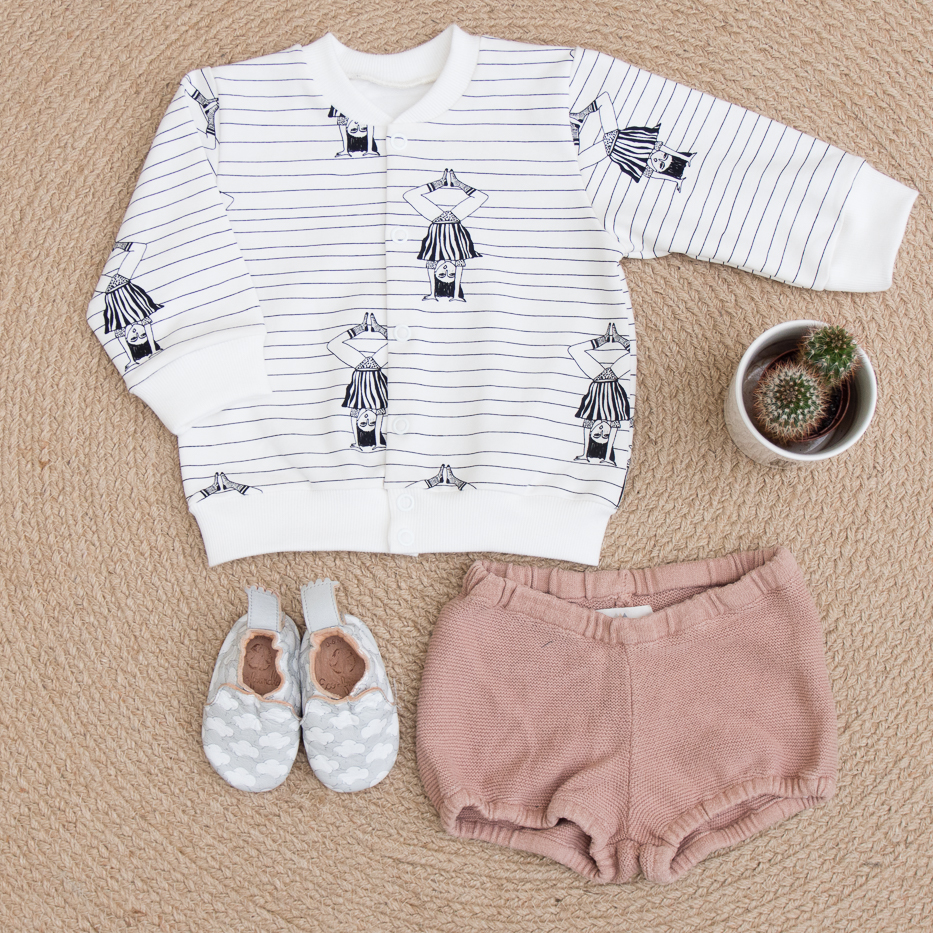 Het eerste plan was om een kruippakje te maken. Dat deed, zeker in de ruime variant die het geworden was, nogal pyjama-achtig aan. Ik besloot de benen weg te knippen en er een bomber van maken. Ik zette er onderaan en aan de hals boordstof aan (de witte van de eerste collectie van See You at Six). Uiteindelijk ben ik best tevreden van de ‘save’. Het staat haar heel grappig vind ik. Helemaal hoe ze zelf is tegenwoordig.