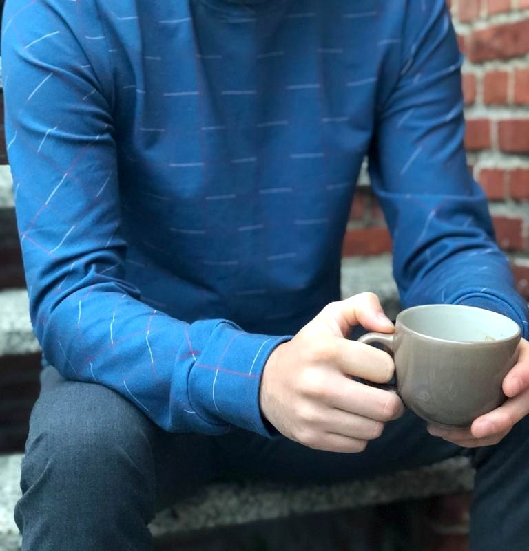 Bij het zien van de nieuwe French Terry stoffen van Lotte Martens, zag Wouter meteen een T-shirt voor zichzelf uit deze petrolblauwe grid. Tot hier plots best een grote lap stof aan mijn voordeur geleverd werd. Het T-shirtproject werd een trui-project.
