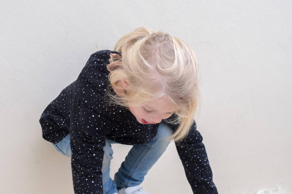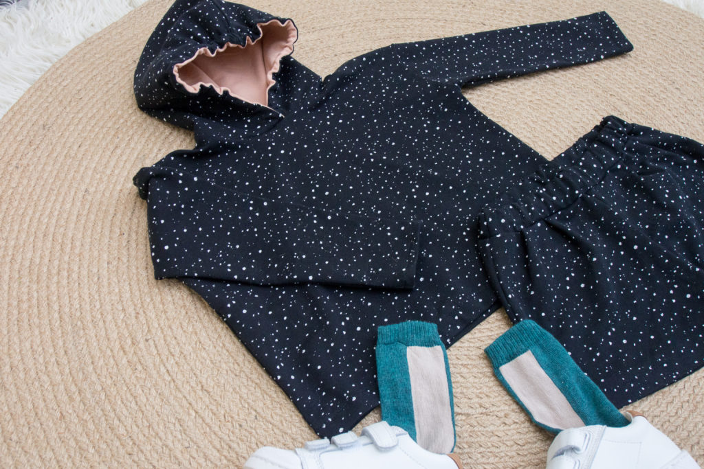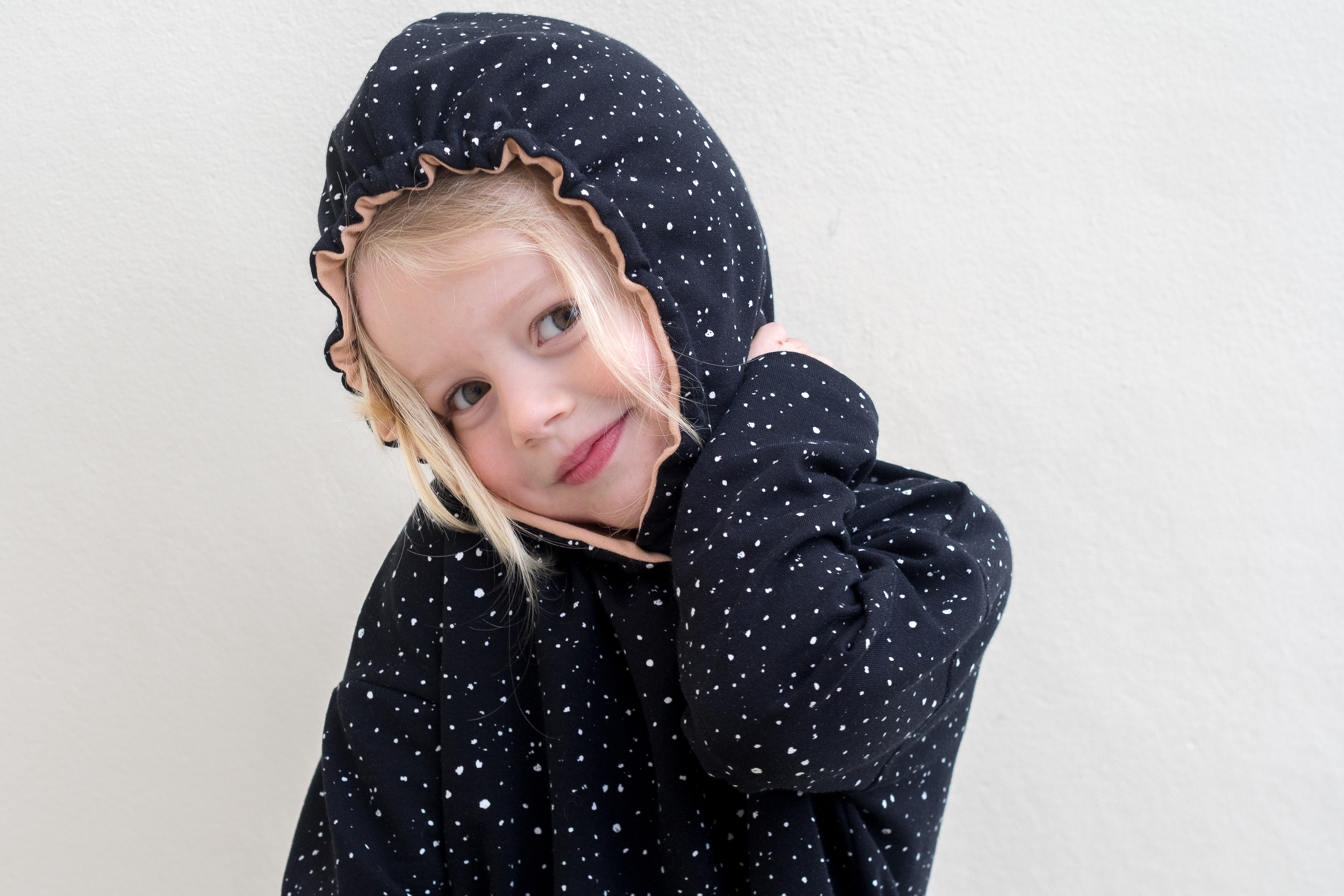 Toen ik de nieuwe monochrome collectie van About Blue Fabrics zag, dacht ik meteen aan coole sportkledij. Ik koos voor de ‘Spotty’ en maakte een kaptrui met shortje voor Jente. De stof is een lekker soepele en zachte kwaliteit en ook al is deze achteraan wit, toch zie je nergens die witte schijn wanneer je stikt en de stof uitrekt. Bovendien hebben alle stoffen ook het oeko-tex label. Ik ben fan!