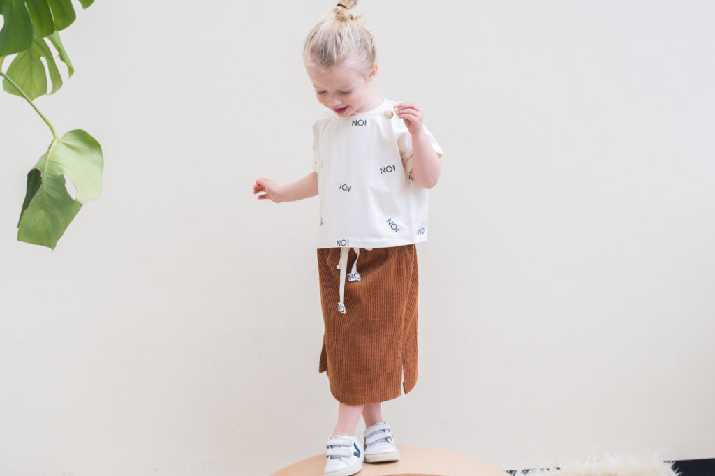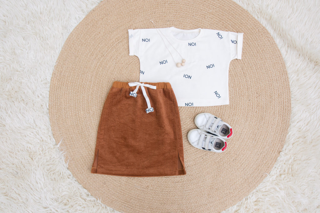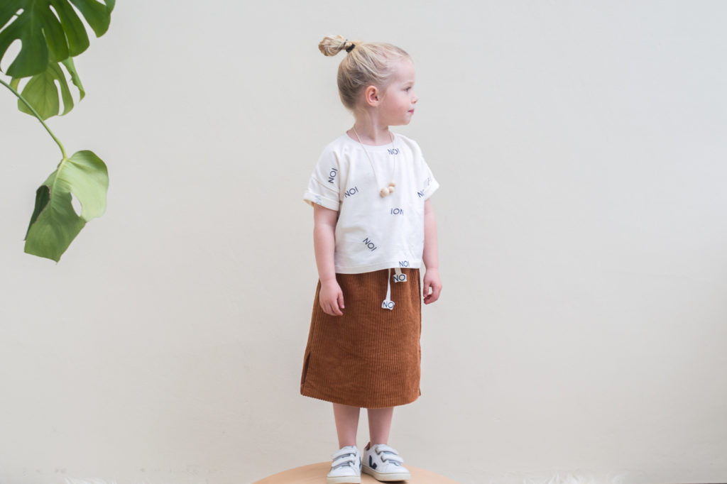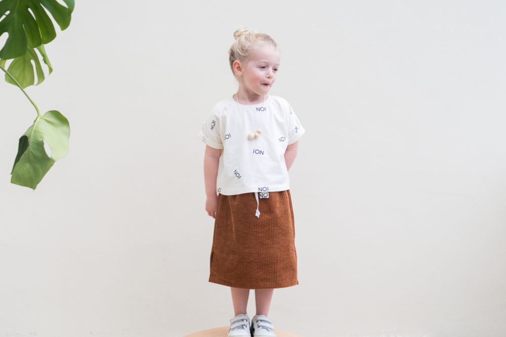 Deze shirt-rokjes combinatie zat al een tijdje in mijn hoofd. Maar het kwam er nooit van om de rest corduroy van dit project te verwerken. Zoveel te mooi om te laten liggen, dus we doen hier van ‘winterstofje voor de lente’.