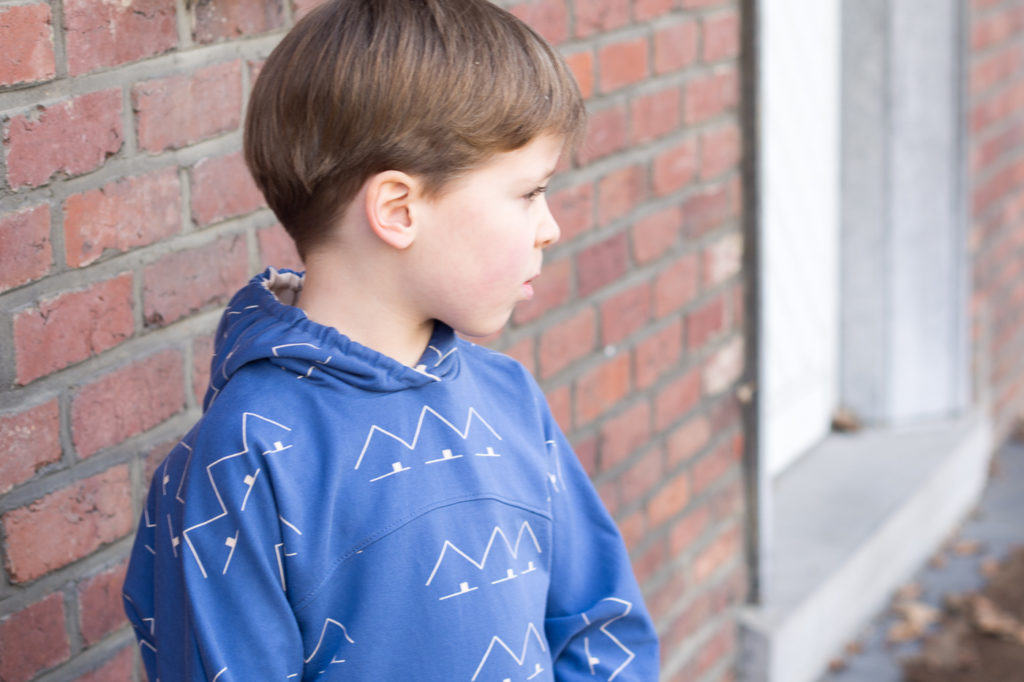 Voor W. maakte ik een Teddy sweater met kap uit de Home Sky Blue stof. De boorden knipte ik uit de stof zelf. Dat werkt hier perfect omdat de kwaliteit van de stoffen heel zacht en soepel is. De kap tekende ik uit in alle maten van het Teddy patroon en je kan deze kap add-on gratis terugvinden in de webshop.