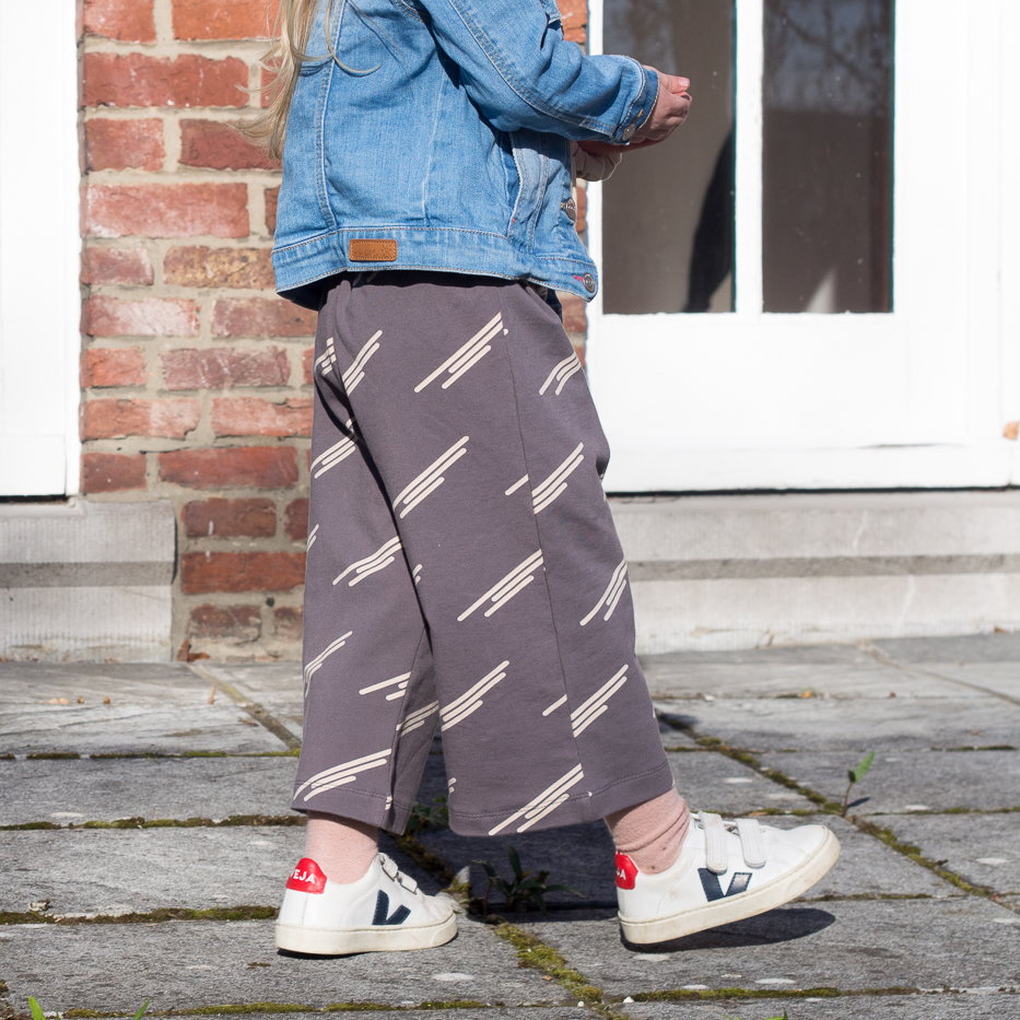 Jente kreeg verder ook nog een Clara culotte in de Fog Carbon Gray stof. Ik naaide de simpelste versie (zonder linten), maar maakte er een smalle paperbag waist van (Tailleband ietsje breder knippen – vb.2cm – dan het patroondeel en dan op 1cm van de dubbelgevouwen zijde een stiksel geven. Dan de tailleband aan de broek zetten en elastiek rijgen).