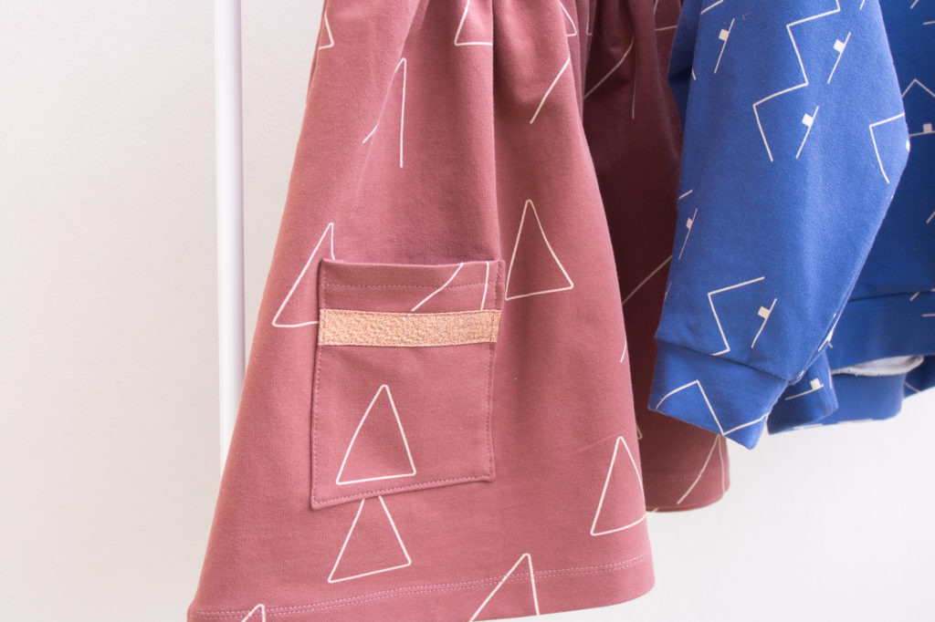 Voor Jente maakte ik een Eloise jurk van MinnieMie. Die werd hier al in veelvoud gedragen en goedgekeurd. Ik blijf enorm grote fan van dit gratis patroon. Ik naaide zakjes op het voorste rokdeel en combineerde met een koperkleurige blinkende biais (en nog één van mijn oude labeltjes, het laatste 😉 ).