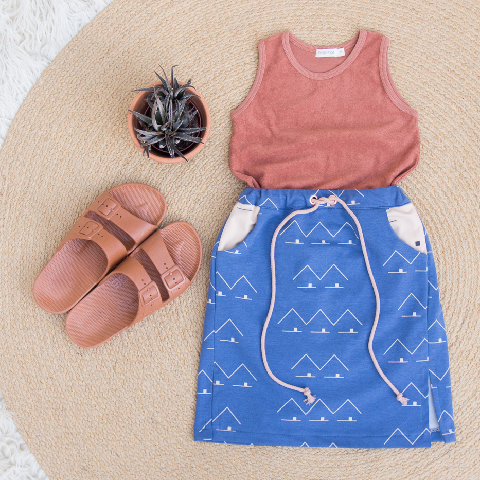 Wat stofkeuze betreft, kan je eigenlijk alle kanten op. Ik maakte hem zelf in zowel rekbare als niet-rekbare stoffen. De stof op deze foto’s is een zachte french terry (victory sky blue) uit de stoffencollectie die ik ontwierp voor About Blue. Als je een dikkere stof kiest, zoals ik meestal deed, valt het rokje wat ‘boller’, dan ‘staat’ het wat meer. Kies je bijvoorbeeld voor een soepele viscose, dan valt het rokje mooi langs het lichaam.
